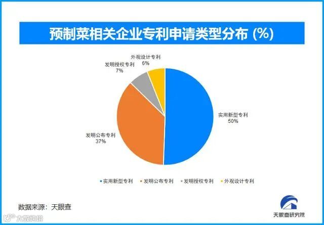 对于预制菜中的技术与工艺,天眼查专业版数据显示,截至目前,预制菜相关的专利申请共为1042条,其中实用新型专利占比50%,达到其他三项专利申请数量的总和;其次发明公布专利占比37%。