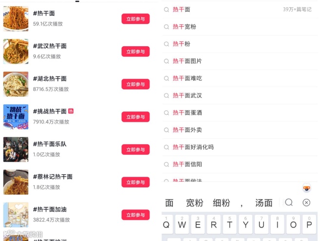 如抖音上,热干面相关话题有近60亿的曝光,其中#热干面59.1亿、#武汉热干面9.6亿、#蔡吉林热干面1.8亿;小红书上,和其相关的种草笔记也高达45万多篇,且在持续增加中。