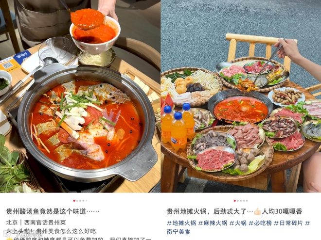 首先,酸汤鱼和地摊火锅率先出征,成功吸引了全国人民的目光,填补了他们对贵州菜系的认知空白。