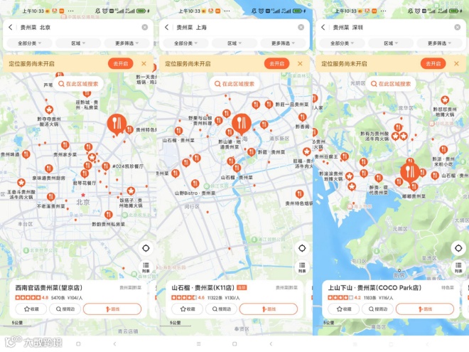 除成都外,北上广等城市也出现主打“贵州菜”的专门店,如北京的迎黔城·贵州·私房菜、深圳的嘟嘟贵州菜、黔筵·贵州菜等。