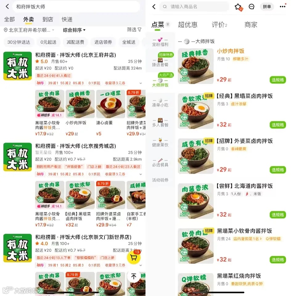 近日,和府捞面在北京、上海、深圳等地上线了多家“和府拌饭大师”,主打拌饭外卖。门店推出了黑塌菜卤肉拌饭、外婆菜卤肉拌饭等多款拌饭,价格在29元起。此外还销售多款套餐、小吃等。