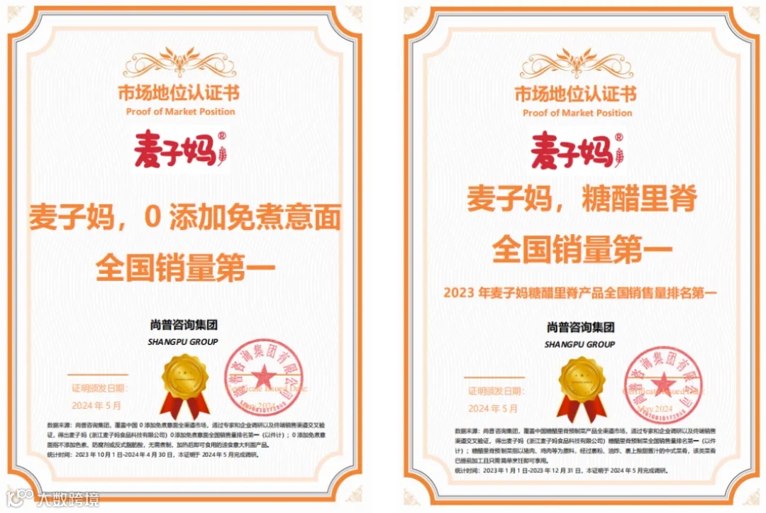 近日,麦子妈官方微信公众号发文显示,2024年5月,浙江麦子妈食品科技有限公司“麦子妈”品牌荣获尚普咨询授予的“麦子妈糖醋里脊全国销量第一”和“麦子妈0添加免煮意面全国销量第一”两项重磅认证。