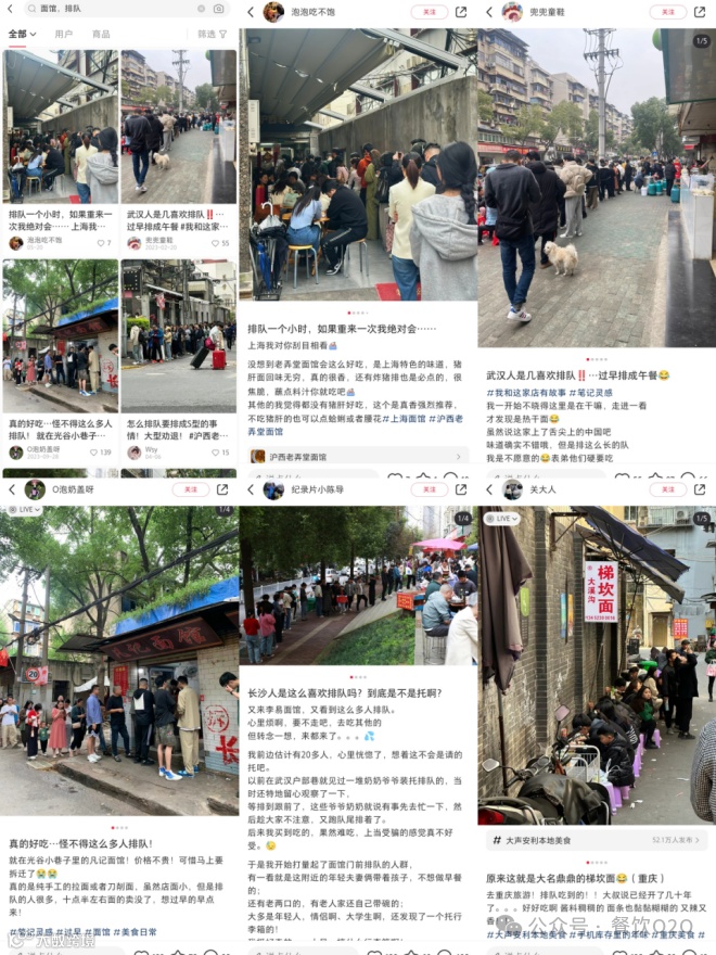 实际上,不仅这些烟火气十足的面馆受到追捧,许多类似的地方性馆也开始吸引大量食客。在小红书等社交媒体平台上,搜索“面馆”和“排队”关键词,可见武汉、上海、深圳、长沙、重庆等地的面馆都排着长队。这些面馆或隐匿于小巷深处的社区,或开设在繁华的街道旁,人来人往,热闹非凡。