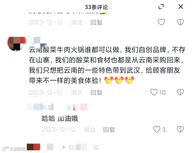 然而,真正的创始人却表示:“云南酸菜并非专利,我们自创品牌,并非山寨。我们只想将云南酸菜火锅带到武汉。”