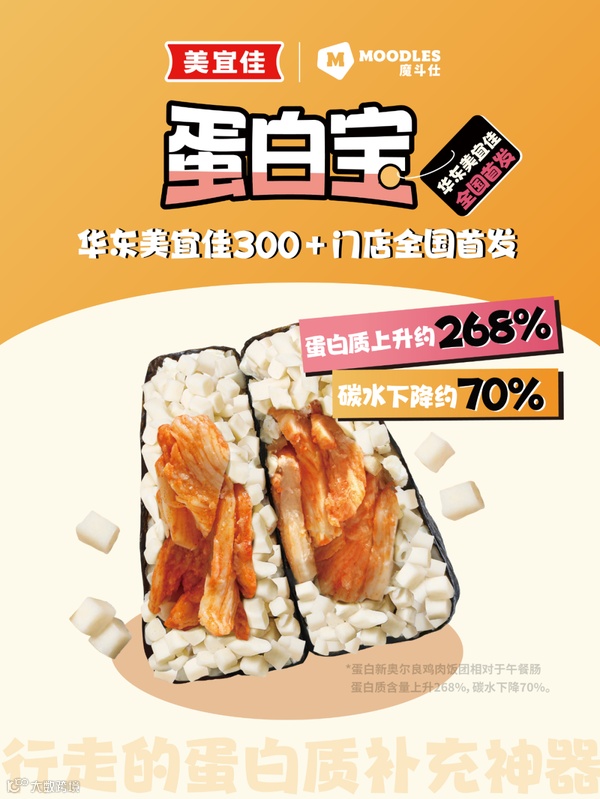 MOODLES魔斗仕再次突破对健康食品的想象,针对传统早餐高碳水、高油脂、低营养的特点,强劲推出新品蛋白宝饭团,并于华东区美宜佳300+门店重磅首发。