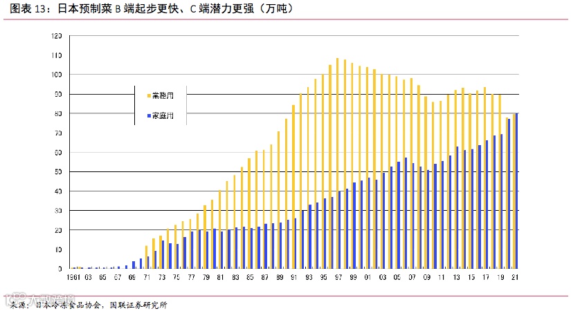 ,才完成C端和B端的持平,国联证券研报显示,1990年,日本预制菜B端和C端产量占比是7:3,到2021年,该比例首次达到5:5。