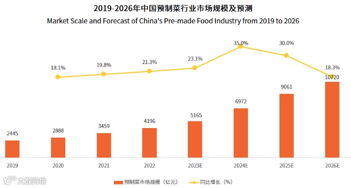 艾媒咨询数据显示,2022年中国预制菜市场规模达4196亿元,同比增长21.3%,2026年将达到10720亿元。