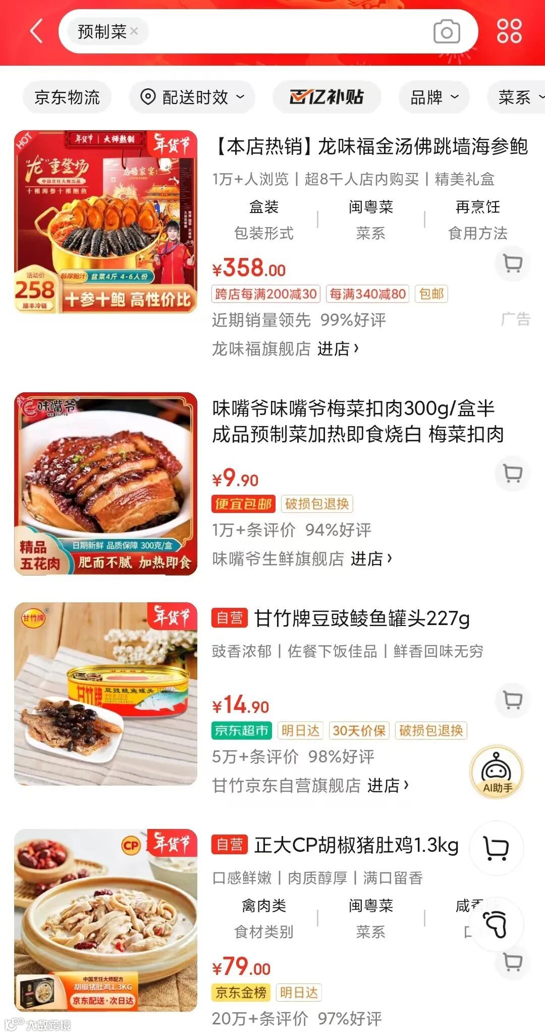 在淘宝、京东上搜索“预制菜”,在销量排前的产品中,佛跳墙、猪肚鸡、梅菜扣肉赫然在列。
