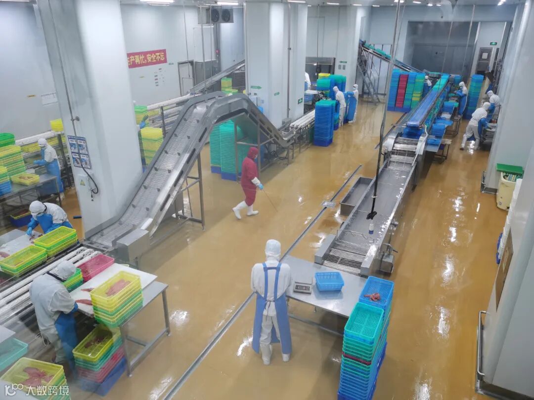 在基地的食品加工车间参观通道,多个大型车间内,工人们“全副武装”正在进行着三文鱼、鳕鱼等预制菜原料的加工处理。