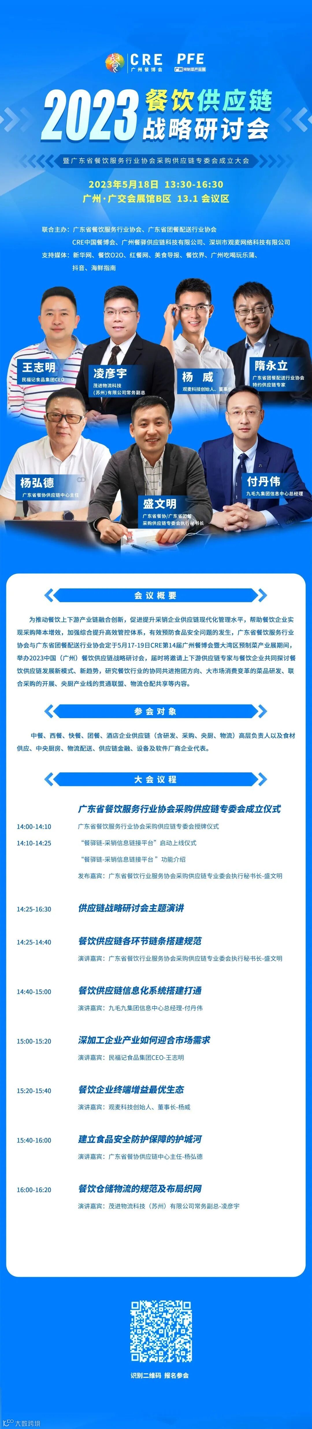 餐饮连锁化已成为餐饮行业发展的主流趋势,与之相适应的餐饮供应链也发生了深刻变革,疫情凸显了供应链的重要性。如何搭建出符合自己发展阶段的供应链体系?从前端供应链寻源到后端的品控、采购、食安、仓储物流到餐厅应用等供应链组织到底如何搭建?到底是自建供应链还是与第三方供应链企业合作?这些问题,都可以在2023年餐饮供应链战略研讨会上找到答案。大会同时成立广东省餐饮服务行业协会采购供应链专委会