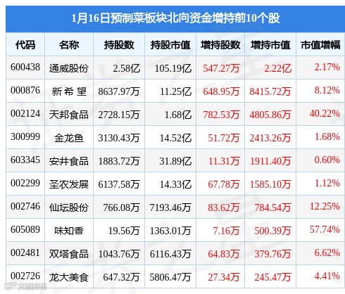北向资金方面,当日预制菜板块北向资金持股市值为211.72亿元,增持3.47亿元。其中增持最多的是通威股份,增持了2.22亿元。减持持最多的是温氏股份,减持了0.83亿元。