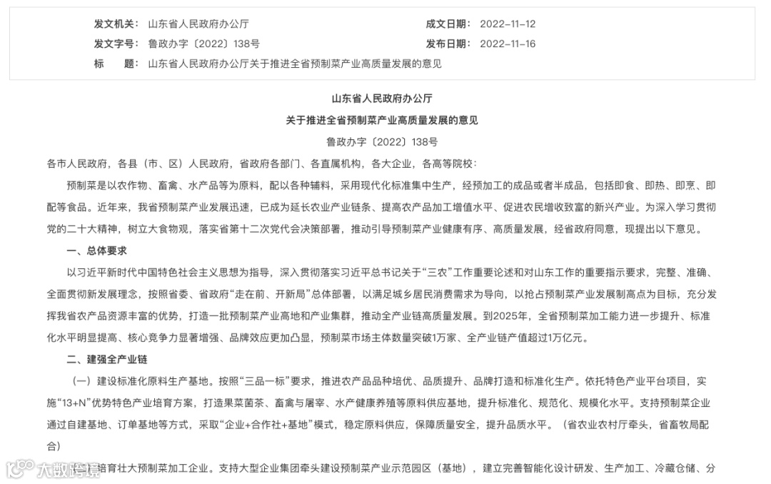 山东省《关于推进全省预制菜产业高质量发展的意见》截图