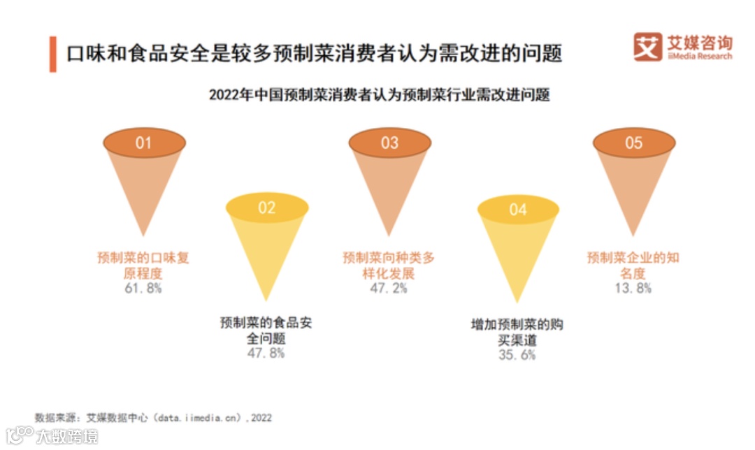 艾媒咨询发布的《2022年中国预制菜行业发展趋势研究报告》显示,中国预制菜消费者认为预制菜行业需改进的问题前三位分别是:预制菜的口味复原程度(61.8%),预制菜的食品安全问题(47.8%),预制菜向种类多样化发展(47.2%)。
