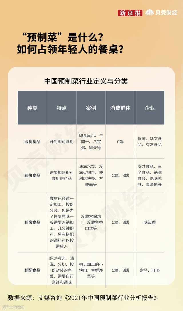 据新京报,预制菜,顾名思义,是指以农、畜、禽、水产品为原料,配以各种辅料,经预加工而成的成品或半成品。通过需要加工的程度多少分为即食食品、即热食品、即烹食品、即配食品。