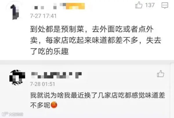 对此,不少网友在社交媒体上分享自己的感受:“预制菜彻底摧毁了我吃外卖的动力,也包括一些堂食。”“在极致追求降本增效的餐饮行业,标准带走野趣,只剩下统一的味蕾在哭泣了。”