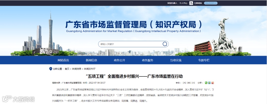 7月4日,广东省市场监管局官网发布《“五项工程”全面推进乡村振兴——广东市场监管在行动》相关公告。
