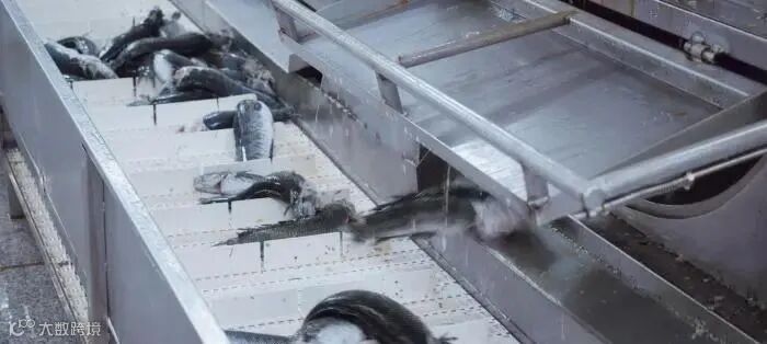 制造车间正将新鲜的黑鱼进行机械化打鳞