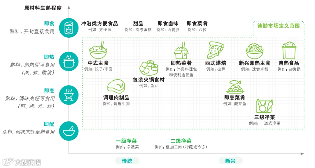 德勤对预制菜市场的定义包括中式主食、 调理肉制品、 包装火锅食材、 即热菜肴、 西式烘培、 即烹菜肴、 三级净菜、 新兴即热主食和自热食品, 共九个细分品类。