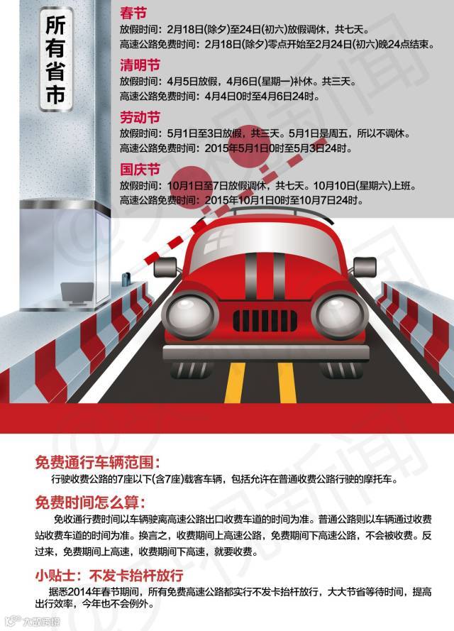 据悉,2014年春节期间,所有免费高速公路都实行不发卡抬杆放行,大大节省了等待时间,提高出行效率,今年也不会例外。