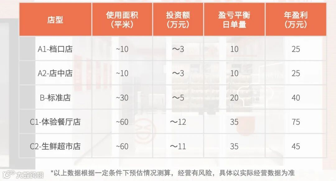按照舌尖科技为加盟商计算的成本和投入,以A类档口店(面积在8-10平米)为例,每天只要有10单(客单价50元左右)销售就可以实现收支平衡。如果A类店能拉到2000个新客户,假设每个新客户每个月下单(客单价50元左右)一次,就意味着该店平均每天有67个订单,以此计算日营业额在3300元左右,毛利在1650元。
