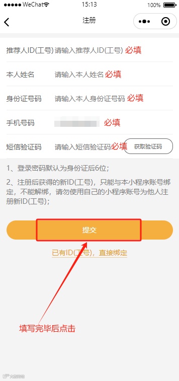 2.在开通金科会员页面,请注意所有的选项都是必填项,您账号绑定的手机号码会自动填写,若您在金科严选小程序有经销商推荐人,则推荐人工号会自动填写为您的推荐人工号,否则需要您手动填写推荐人工号(激活工号需由推荐人协助处理,请与您的推荐人保持联系),姓名与身份证信息需保证真实有效。