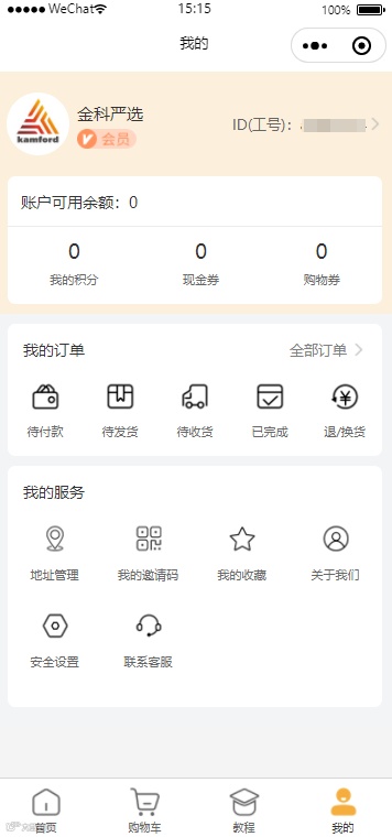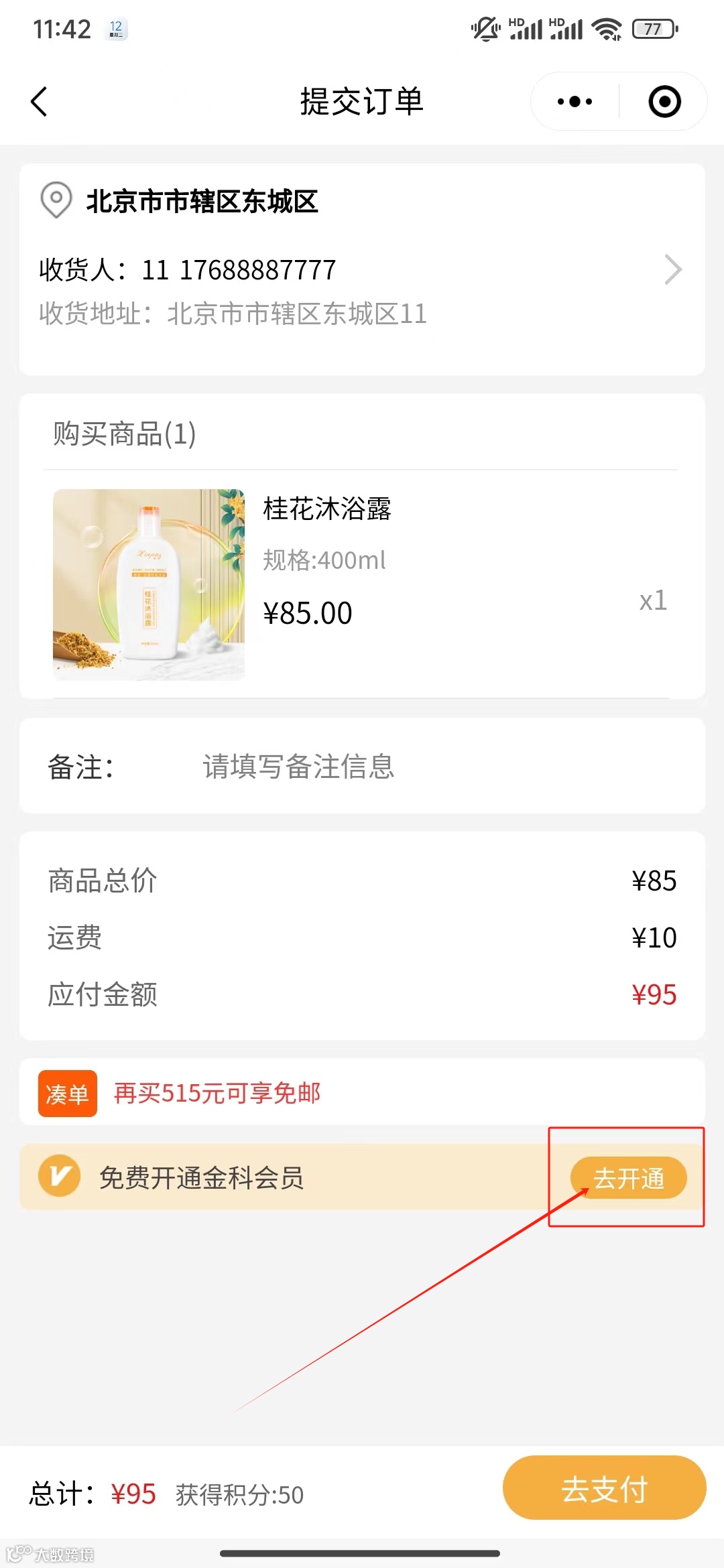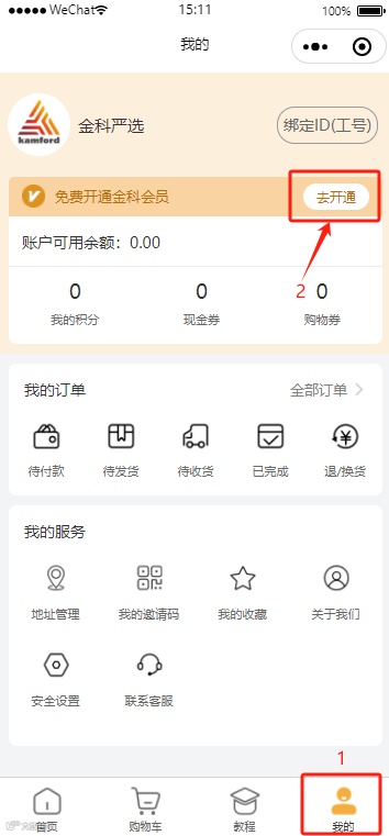 1.若您是未绑定工号的普通会员,有两个入口可以进入开通金科会员流程,一是在【我的】页面头像下方点击【去开通】按钮,二是选择任意商品提交订单,在提交订单页面底部点击【去开通】按钮;