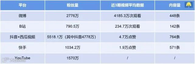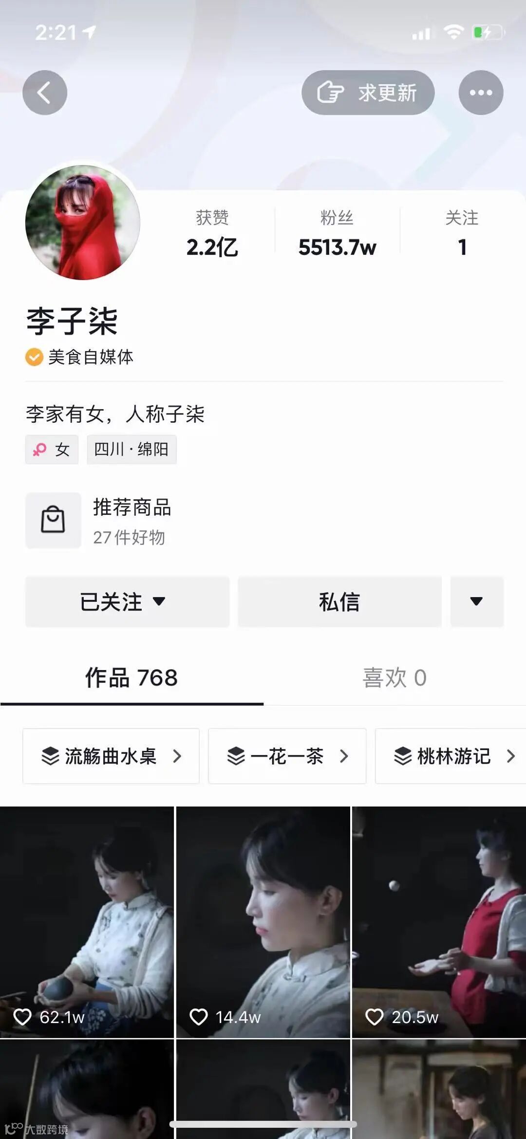 据统计,李子柒在国内多个平台拥有超1亿总数粉丝。其中微博粉丝2776万,B站粉丝790万,抖音和西瓜视频粉丝都超5500万,快手则是1034万。