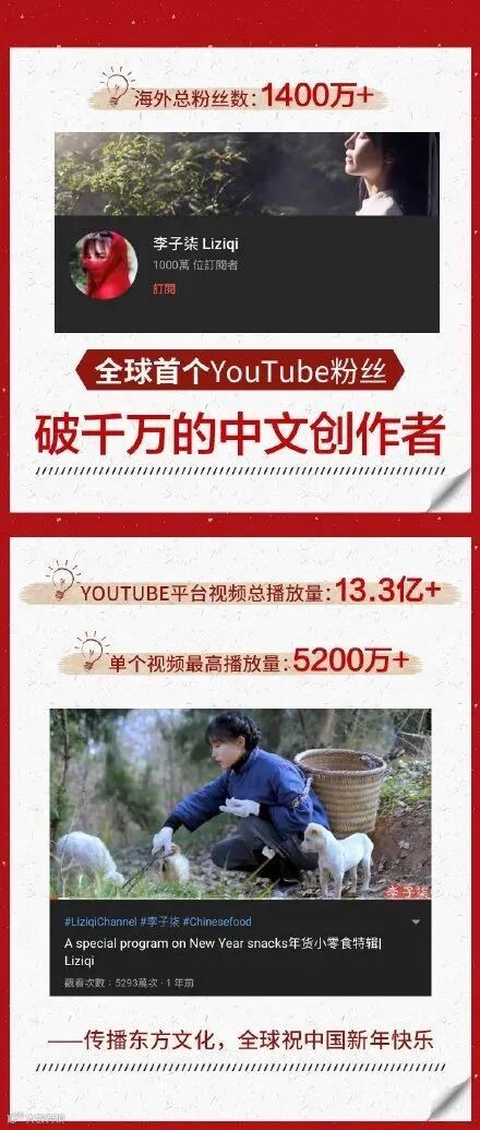 李子柒光是在YouTube上每个月就有50万美金左右的广告联盟收入,一年算下来有600万美金,也就是近4000万人民币级别的广告收入。