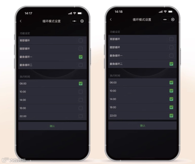 用户可通过小程序自定义唤醒姿势、铃声和按摩组合。量身打造理想的清晨时刻。