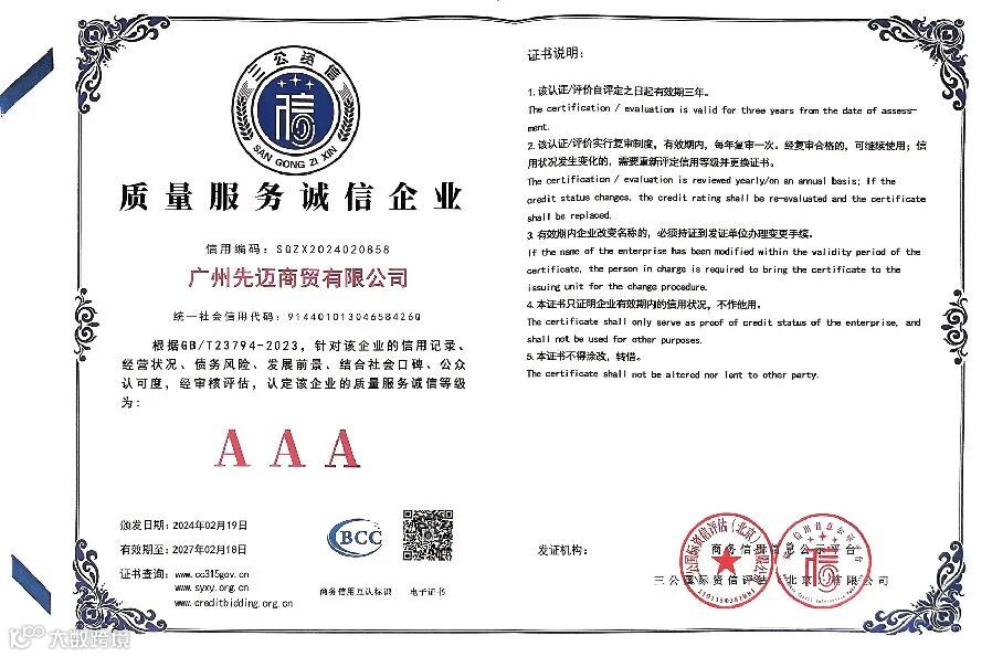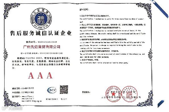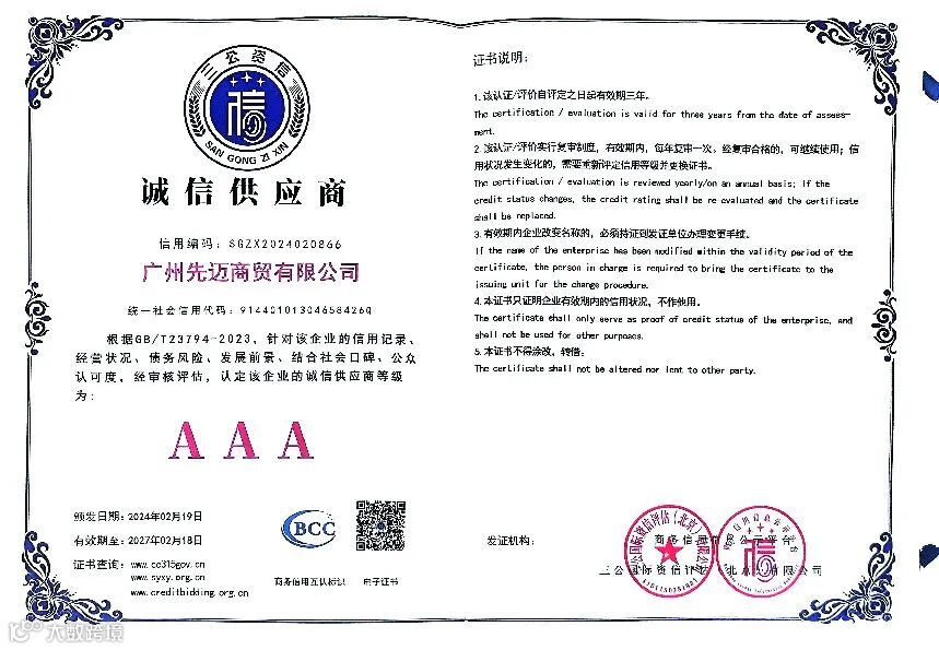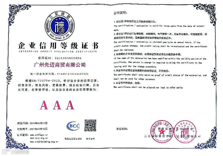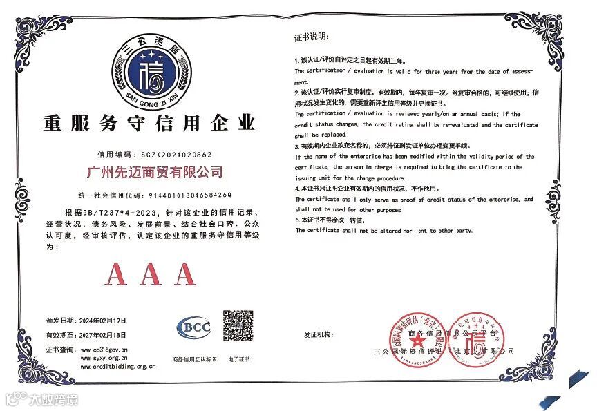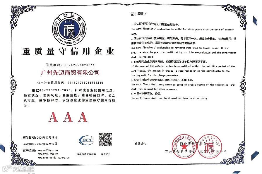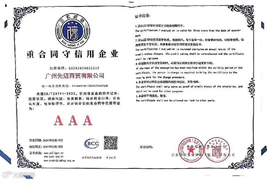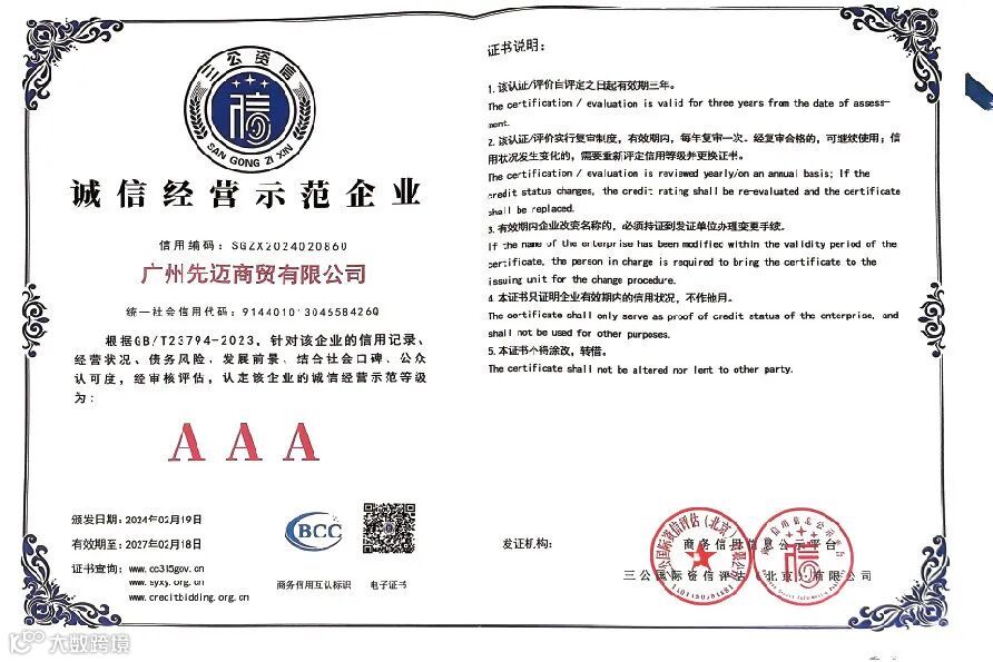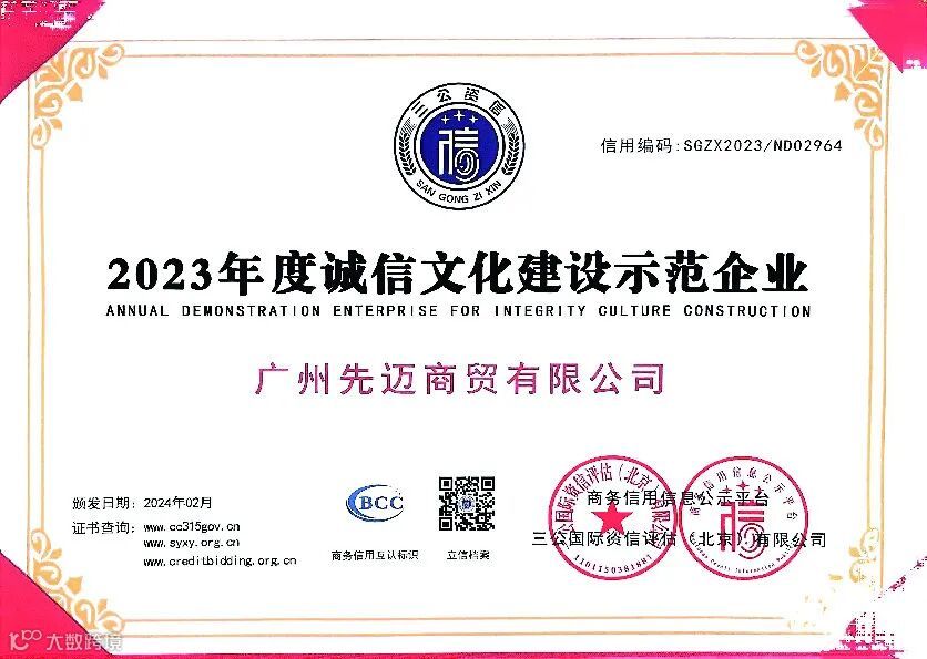 恰好,近期有一些喜讯先跟大家分享,先迈网再度荣获国内权威信用服务机构三公国际认证的“2023年度诚信文化建设示范企业”、“AAA级诚信供应商”、“企业信用评价AAA级信用企业”、“AAA级重合同守信用企业”、“AAA级诚信经营示范企业”等11个诚信企业荣誉资质。