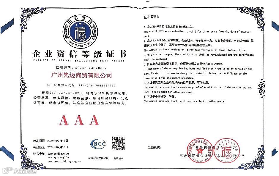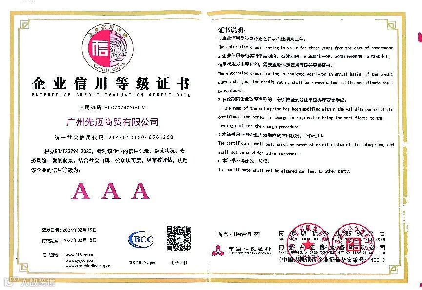 要知道,AAA企业信用评级是企业信用评价中最高的信用等级,它可以广泛应用于市场准入、重点企业申报、资质认定、项目申请、示范基地创建、信用保险等各项工作中,为先迈网未来发展增添了强大的软实力。