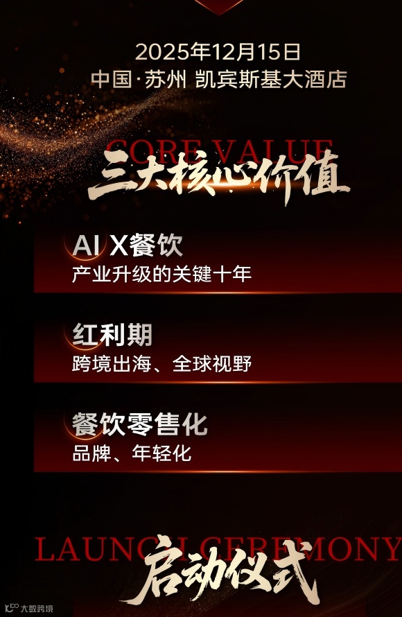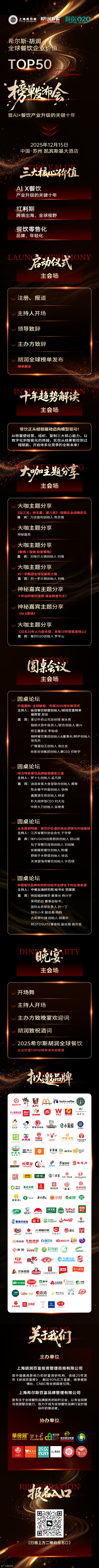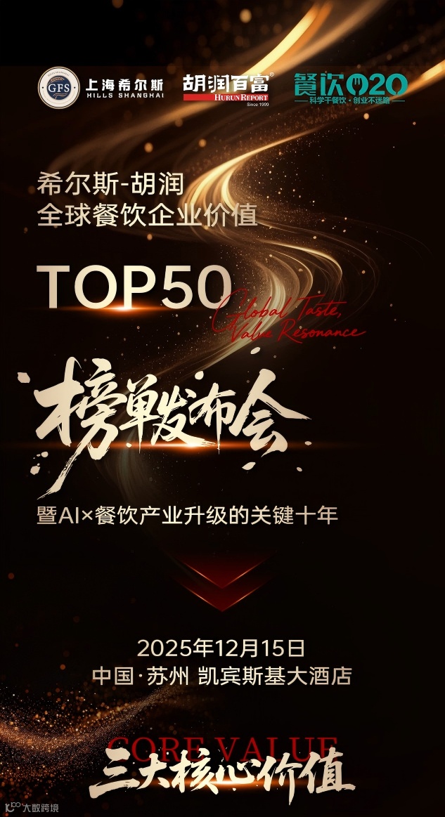 基于此,12月15日,胡润百福联合餐饮O2O及餐饮业上下游企业,在中国·苏州 凯宾斯基大酒店举行2025希尔斯·胡润全球餐饮企业价值TOP50榜单发布会暨AI×餐饮产业升级的关键十年,餐饮O2O邀您共同见证一场聚焦“科技+全球化+零售化”的餐饮战略级峰会!欢迎大家扫码报名!