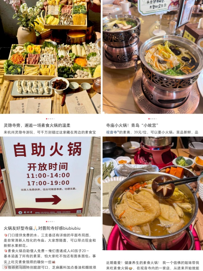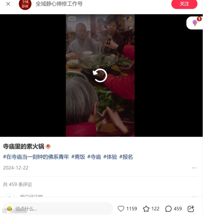 寺庙火锅的存在感同样不容小觑,小红书推荐笔记近万篇。@全缘精心禅修官方号曾分享一则视频:僧人与信众家庭围坐,涮煮萝卜、菌菇、时蔬等素菜,画面传递出 “人间烟火与禅意共生” 的氛围,收获上千点赞。