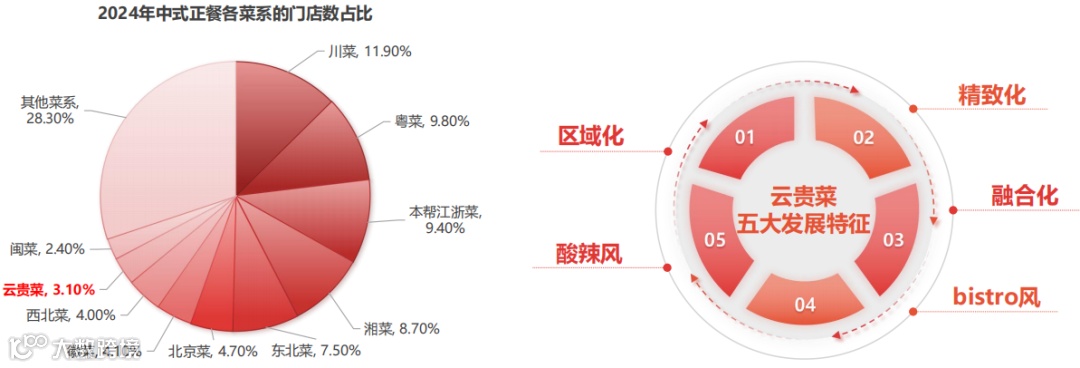 云贵菜的五大发展特征:《云贵菜发展报告2024》指出,云贵菜以突出的地方风味出圈,同时其也呈现出五大主要发展特征,区域化、精致化、融合化、bistro风、酸辣风。