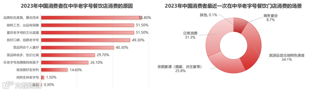 数据显示,关于2023年中国消费者在中华老字号餐饮店消费的原因,51.5%的消费者表示喜欢老字号的文化底蕴,从而进行消费;关于消费者在中华老字号餐饮门店的消费场景,34.1%的消费者表示会在旅游时,为品尝当地特色美食而进行老字号餐饮消费。