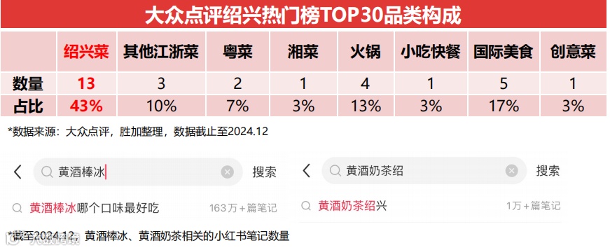 2024年五一假期,美团平台"绍兴菜”搜索量同比增长132.7%。截止至2024年12月,大众点评绍兴热门榜TOP30餐厅中,43%的餐厅为绍兴菜。