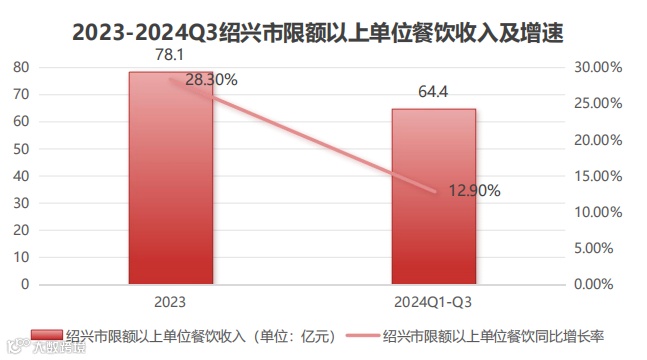 绍兴市统计局数据显示,2023年绍兴市限额以上单位餐饮收入为78.1亿元,同比增长28.3%。2024Q1-Q3,限额以上单位实现饮收入64.4亿元,增长12.9%,增速均居全省首位。