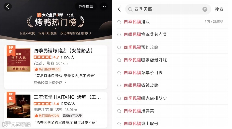 四季民福凭借北京烤鸭的成功塑造,结合小红书、抖音等多平台营销种草,成为外地顾客体验北京美食、本地顾客宴请外地朋友的必打卡。门店排队超过300多号成为常态,仅小红书关于排队的笔记数量就高达3万+篇。