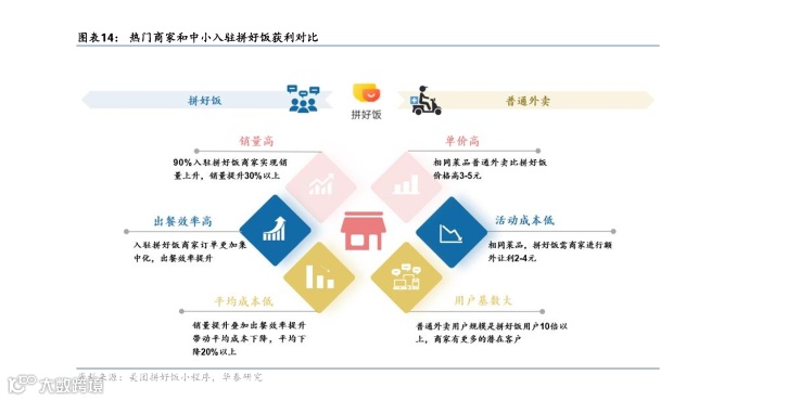 不过要注意的一点是,并非所有商家都适合拼好饭。有业内分析认为,机会可能属于以下三类商家:有成本优势的低客单商家,出餐快、易备餐的商家,消费频次高、硬刚需品类的商家。