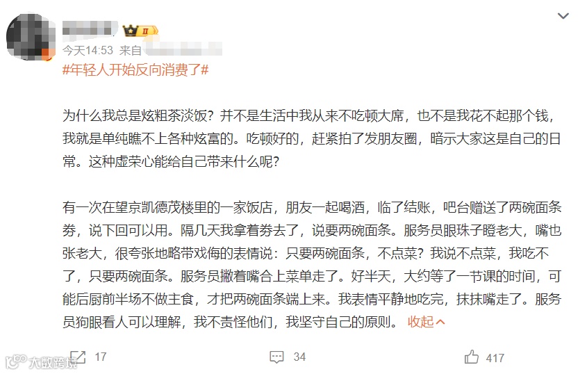 有的年轻人社交需求减弱,更加务实,有了自己新的消费原则,并对花钱炫富的行为逐渐产生了厌倦的情绪,而选择了反向消费。