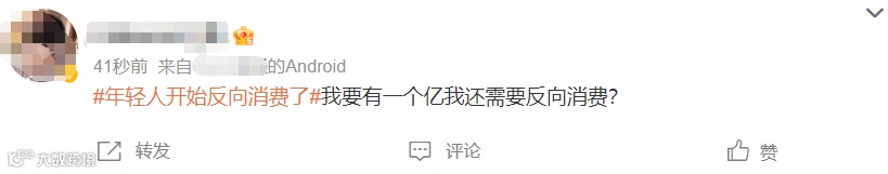 今天,微博话题#年轻人开始反向消费了#登上了热搜NO.1,让年轻人“报复性省钱”的行为产生了超2.4亿的阅读量,13.2万+的讨论量。目前,此数据还在飞速攀升中。