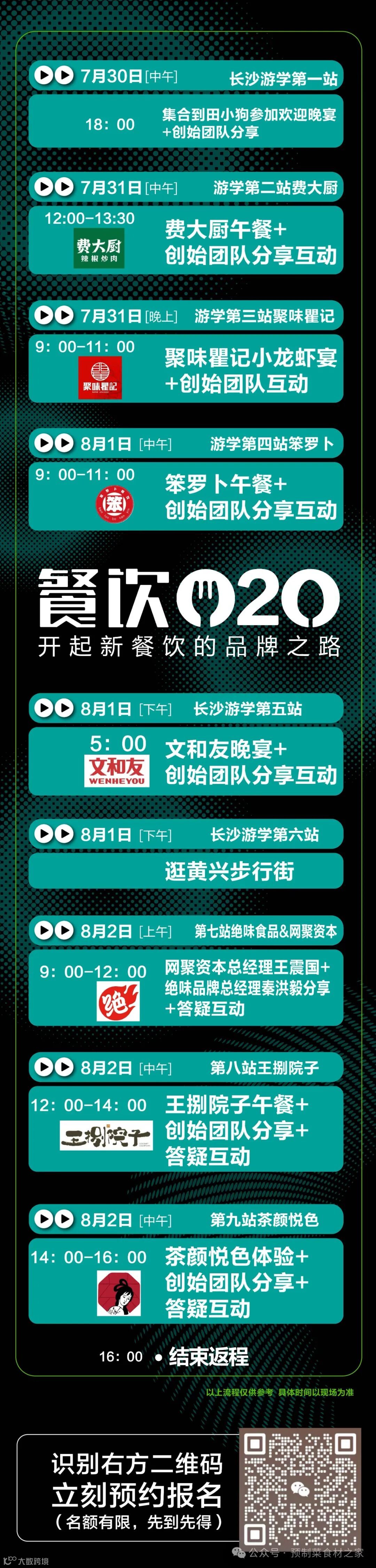 7月30-8月2日餐饮O2O长沙创新餐饮游学团带你走进长沙,开启1000+餐饮创始人大会和长沙创新餐饮游学,深入文和友、茶颜悦色、绝味、王捌院子、笨萝卜、聚味翟记...,与创始团队面对面互动交流,探寻餐饮文创基因以及网红品牌的塑造秘诀。