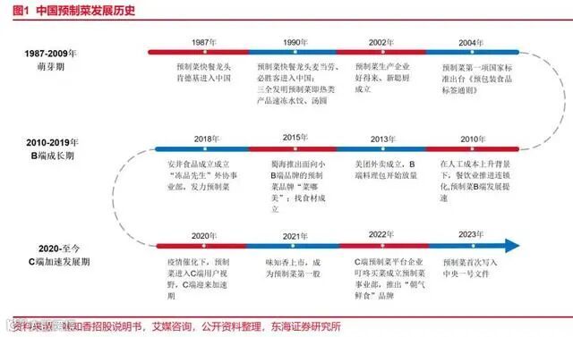 1、萌芽期(1987-2009 年),20世纪 90 年代后期,随着麦当劳、肯德基等快餐店的进入,国内开始出现净菜配送工厂。2000年前后,我国出现预制菜生产企业,对肉禽和水产等原材料进行深加工,逐渐丰富预制菜产品种类。