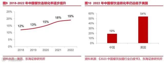 连锁化经营是餐饮品牌发展的必经之路,根据美团数据,2022 年我国餐饮市场连锁化率相比 2018年提升 7pct 至 19%,当前中国餐饮连锁化率仍远低于美国餐饮连锁化率的 54%,随着餐饮连锁化率不断提升,将助推即烹和即配发展,预制菜未来发展空间巨大。