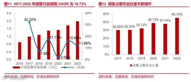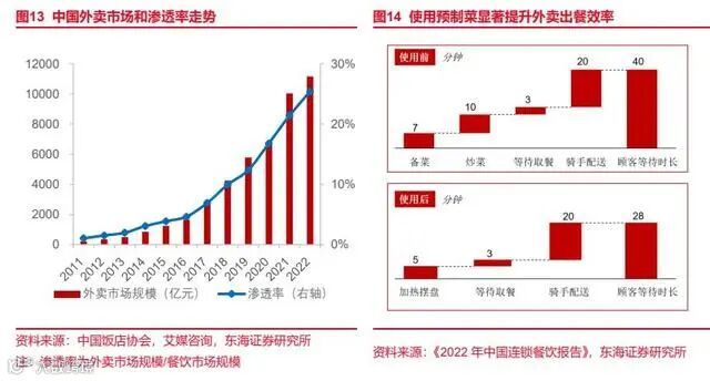 使用料理包后,餐品制作时长可缩短 12 分钟,顾客等待时长减少至 28 分钟。根据艾媒咨询的数据,2022 年在线餐饮外卖市场规模达1.1 万亿,渗透率达 25.4%。