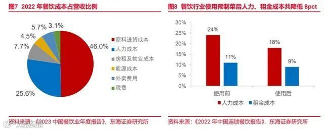 根据《2023 中国餐饮业年度报告》数据,2022 年餐饮人力和房租成本共占营收的 33.3%,人力和房租成本分别同比增长 4.8%和 3.6%。餐饮企业通过使用预制菜能减少对于大厨的依赖和缩减后厨面积,达到降本增效的目的。