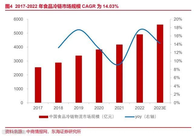 2017-2022 年,食品冷链物流市场规模、冷藏车保有量、冷库容量 CAGR 分别达 14.03%、22.10%、15.41%。2021 年 12月,国务院办公厅印发《“十四五”冷链物流发展规划的通知》,