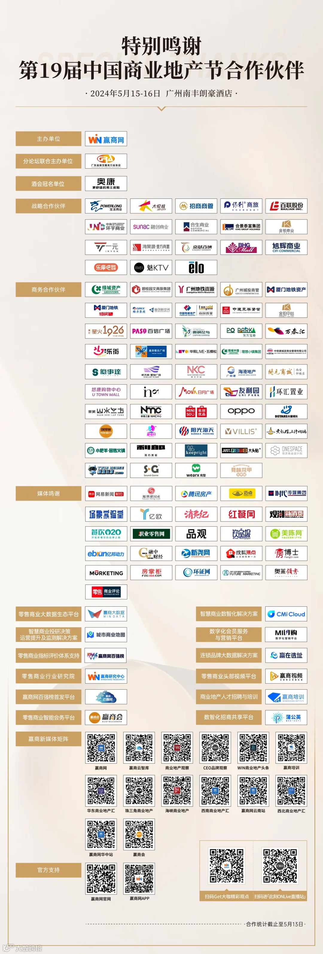 5月16日,主论坛:商业推动地产论坛第19届年会(2)和由赢商网、广东省餐饮服务行业协会联合主办的浪起奔涌•中国品牌出海及加盟高峰论坛隆重启动,以及特邀午宴 2024•招商商管美好生活巡回•广州、与行业大咖面对面的此刻ONLive•直播站、好玩有趣的零售商业地产招商拓展合作展和中国城市商业馆主题展、专业聚焦的分论坛&沙龙、荣耀时刻的颁奖盛典……让各位来宾直呼过瘾。