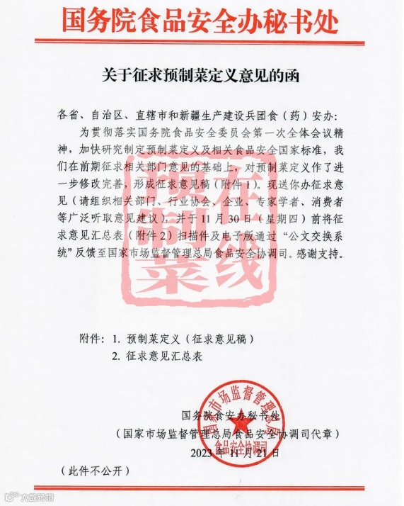 该函件显示,为贯彻落实相关政策,加快研究制定预制菜定义及相关食品安全国家标准,在前期征求相关部门意见的基础上,对预制菜定义作了进一步修改完善,形成征求意见稿。