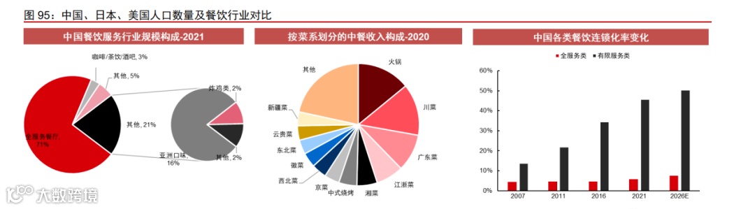中国餐饮连锁化处于发展早期,正持续改善。我国餐饮以正餐类全服务餐厅为主要构 成,2021 年占比约 71%,由于正餐类餐饮服务属性更重、标准化难度较快餐类更高,叠加存在较多的地域化饮食习惯等因素。
